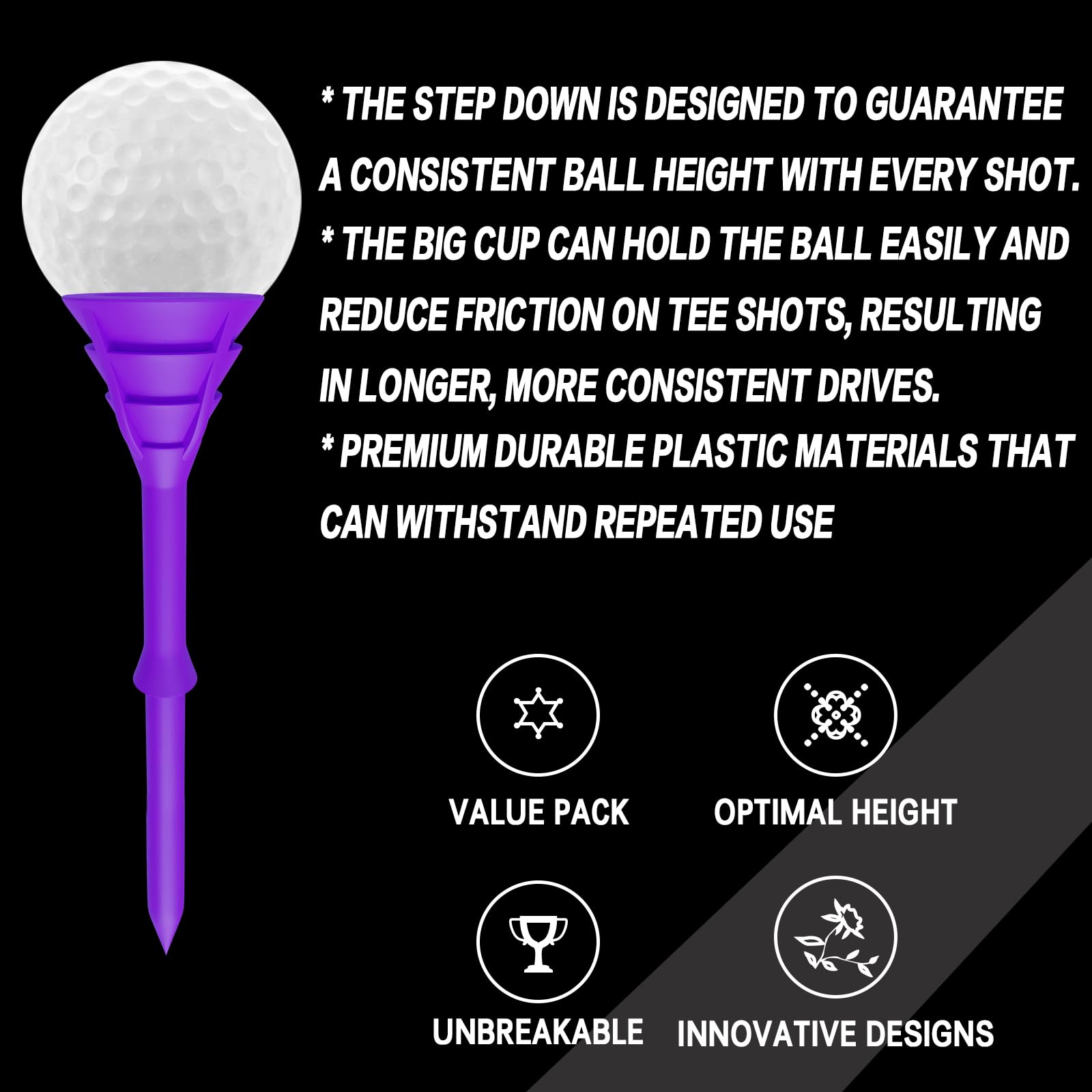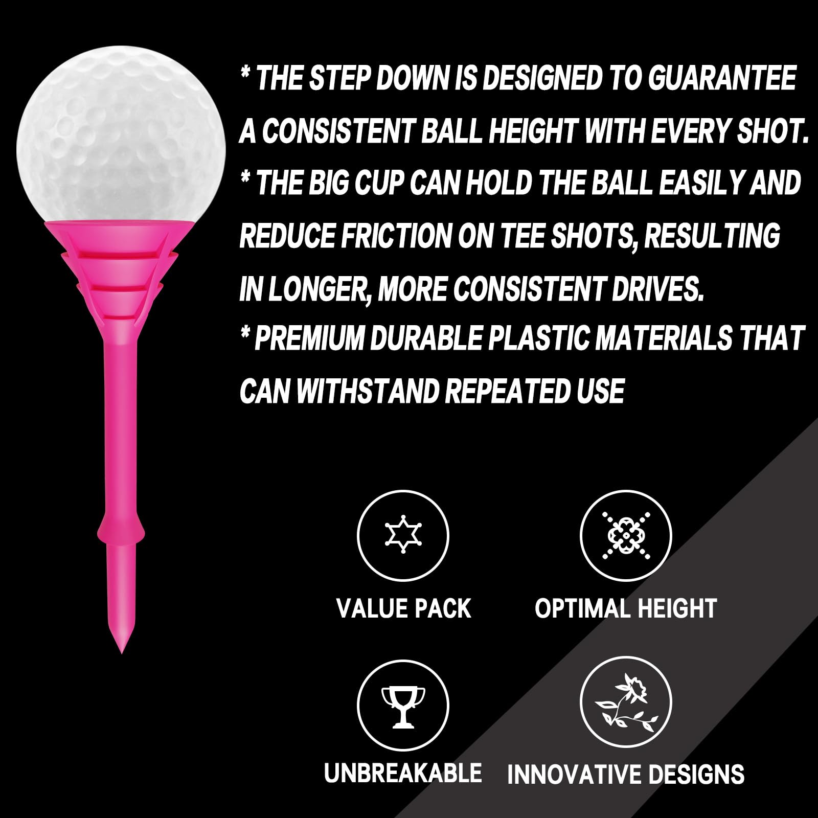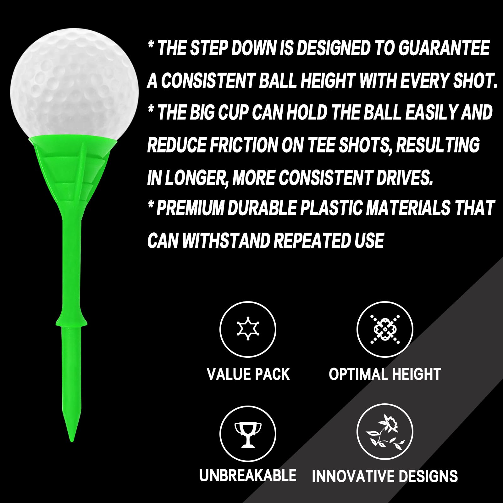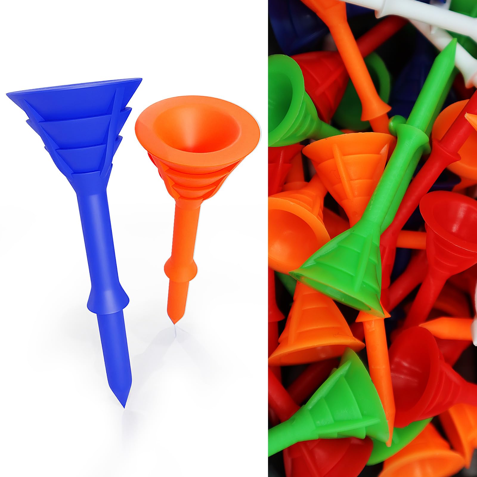 7 Colors Available: The Plastic Tees Come in 7 Colors of Green, Blue, Red, Pink, Pouple, Orange and White, Making Them Easier to Locate After Taking Your Shot. Available 3 1/4 Inch( 83mm). Can Provide You with a Longer and Straighter Drive than the Wooden Tee.