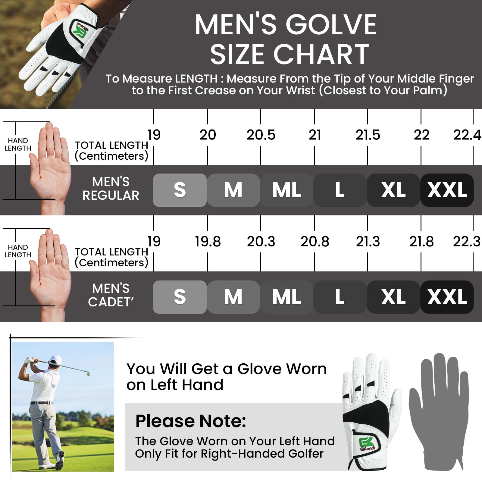 Gloves for Left or Right in Size S M ML L XL XXL Available: Please Check the Attached Picture for Hand Orientation. Worn on Your Left Hand for Right-Handed Golfer, Worn on Your Right Hand for Left-Handed Golfer. The Sizes are Conforms with USA Regular Sizes. No Misunderstanding, Happy Purchase;